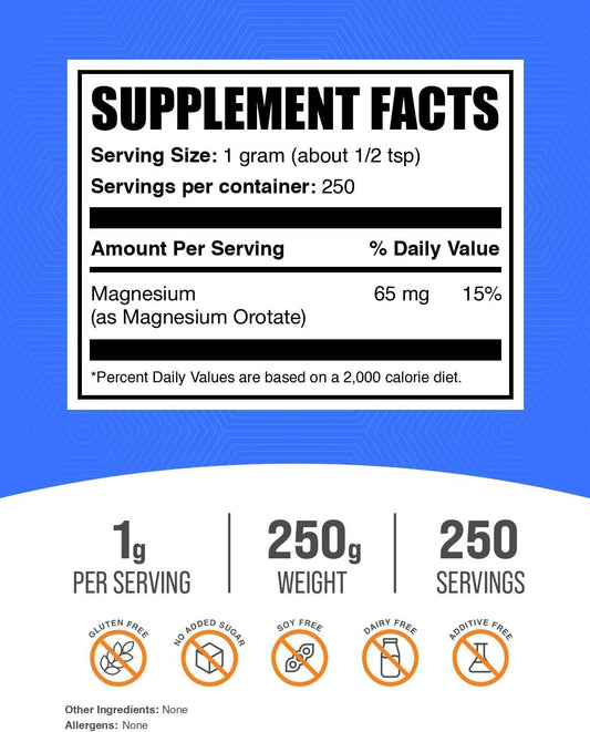 High Absorption Magnesium Orotate Powder - Gluten Free, 1000mg (65mg Magnesium) per Serving - 250g (8.8 oz) - Pack of 1