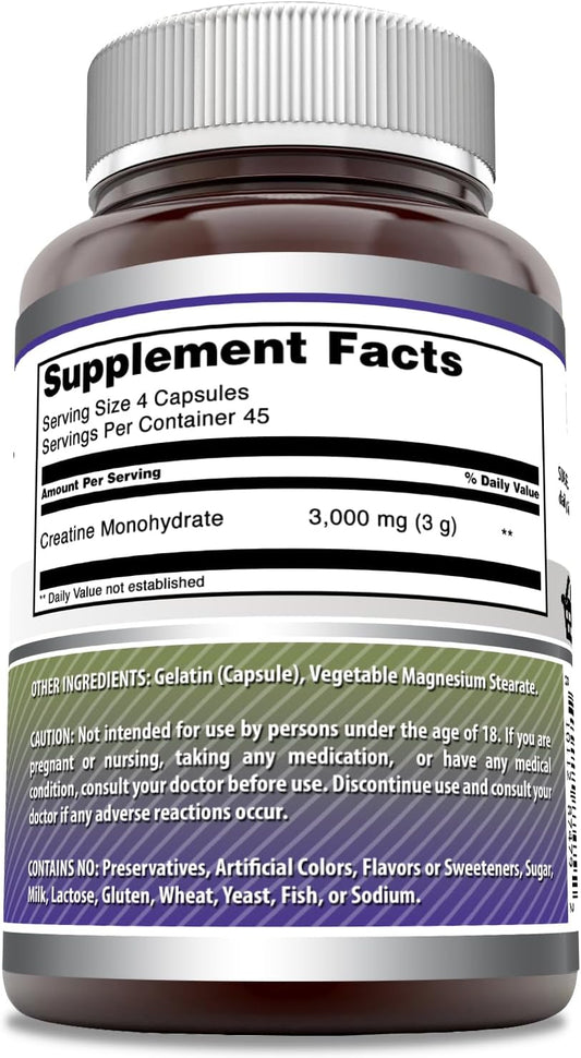 High Potency Creatine Monohydrate Supplement - 3000mg per Serving - 180 Capsules - Non-GMO - Gluten-Free - Made in USA