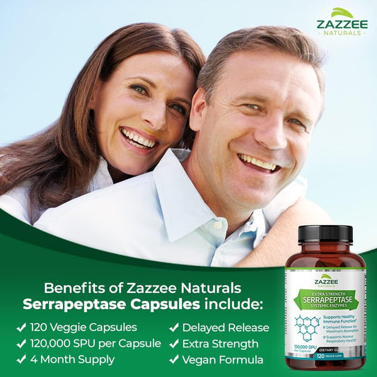 High Potency Delayed Release Serrapeptase Capsules - 120,000 SPU, 120 Vegan Capsules, 4 Month Supply - Extra Strength Systemic Enzymes - Vegetarian and Non-GMO