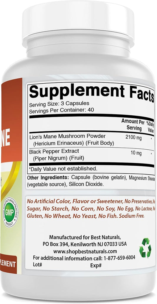 High Potency Lion's Mane Mushroom Supplement with Black Pepper Extract - 2,100mg, 60 Capsules - Vegetarian Formula