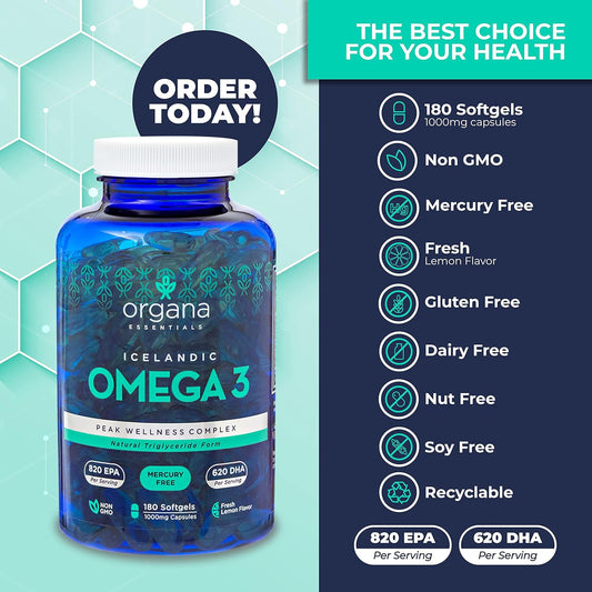High Potency Organa Essentials Omega-3 Fish Oil Supplement - 180 Triple Strength Lemon Flavored Softgels - 2000mg with 820mg EPA and 620mg DHA