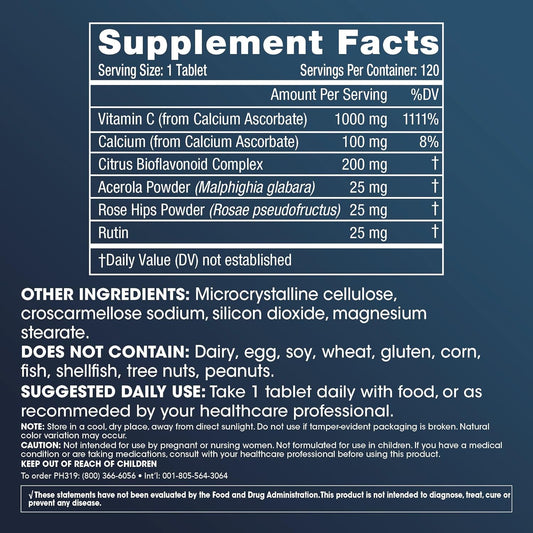 High Potency Vitamin C Complex with Bioflavonoids, Acerola, Rose HIPS, and Rutin - 1000mg, 120 Tablets