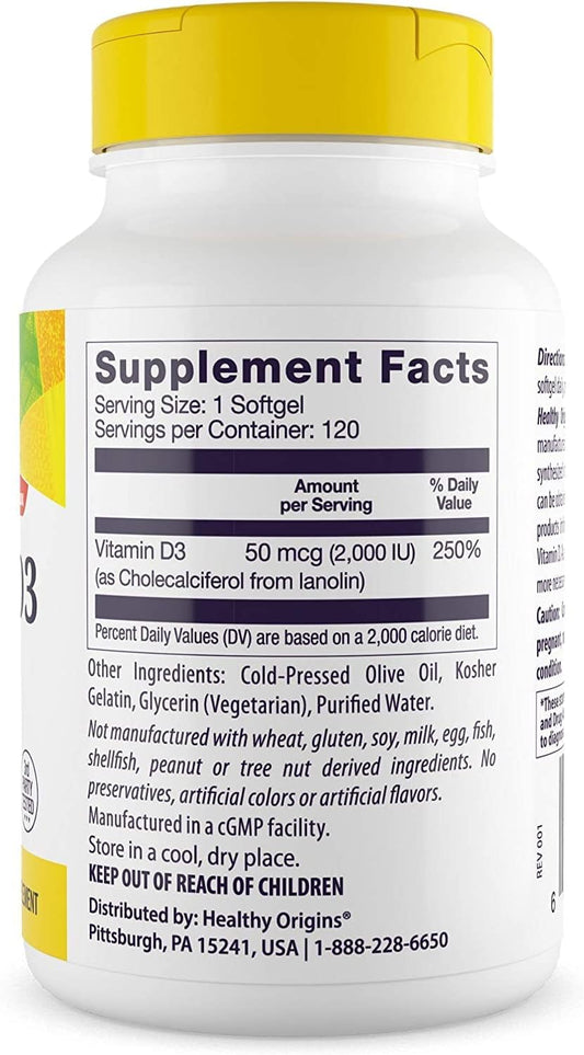 High Potency Vitamin D3 (Lanolin) 2,000 IU Softgels for Bone Health & Immune Support - Gluten-Free & Easily Absorbable D3 Supplement - 120 Count