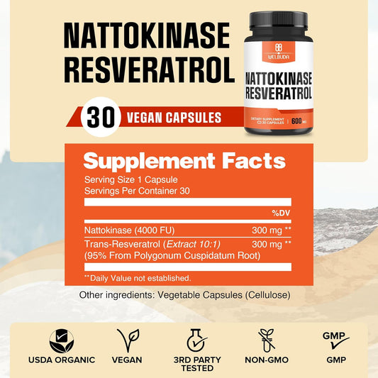 High Strength Nattokinase Supplement with Trans-Resveratrol - Immune System & Heart Support - 30 Servings
