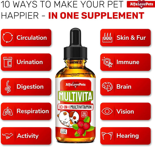 10-in-1 Liquid Multivitamin for Dogs and Cats - Alfa Love Pets - B Complex, C, D3 - Digestion, Urination, Hip & Joint, Skin & Coat - Cranberry Flavor - 2 OzVendor:Alfa Love PetsRegular price $94.99 AUDRegular priceUnit price / per-