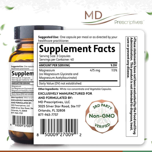 Highly Absorbable Magnesium Dietary Supplement - 120 Capsules with Glycinate & Acetyl Taurinate by MD Prescriptives