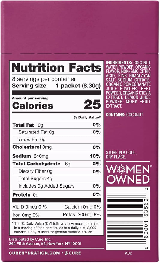 Hydrating Plant Based Electrolyte Mix with Coconut Water - Berry Pomegranate Flavor - 8 Packets, Non-GMO, Vegan, No Added Sugar, FSA & HSA Eligible