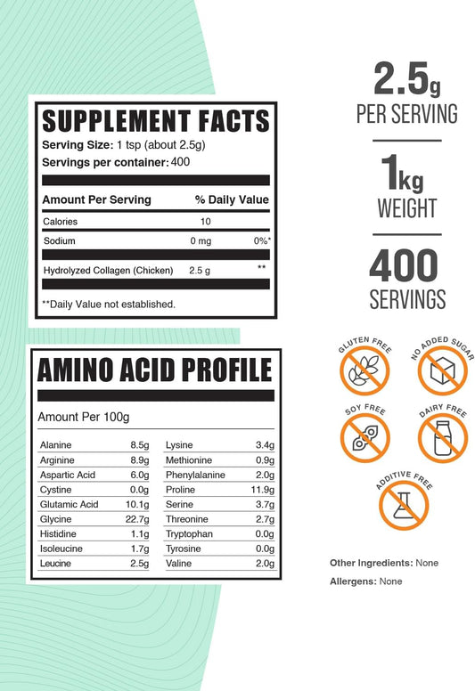 Hydrolyzed Chicken Collagen Peptides Powder - 2500mg per Serving, Gluten Free - 1kg (2.2 lbs) Pack - Collagen Supplement