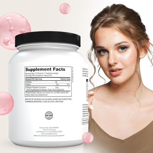 Hydrolyzed Collagen Peptides for Daily Defense - 16oz Powder for Hair, Skin, Nails, Joints & Bone Health - Type 1 and 3, High Absorption Formula
