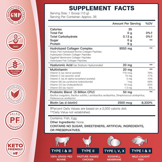 Hydrolyzed Collagen Peptides Powder with Probiotics, Multivitamins, Hyaluronic Acid, and Biotin - 35 Servings - Supports Skin, Hair, Nails, Joints, and Gut