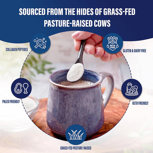 Hydrolyzed Collagen Peptides Powder - Grass Fed Bovine Protein for Joint, Bone & Skin Support - 90 Servings, Type 1 & III, Gluten Free & Non-GMO - 2.2 Lb