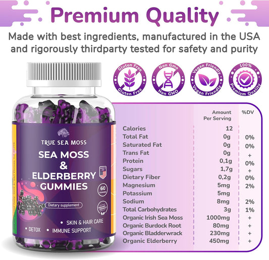 Immune Support Sea Moss Gummies with Elderberry for Adults & Kids, Irish Sea Moss, Burdock Root, Bladderwrack, 120 Gel Gummies for Energy, Pack of 2