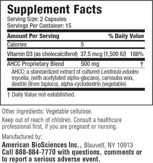 Immune System Support: American BioSciences AHCC Mushroom Extract with Vitamin D3 - 30 Capsules, 500mg AHCC - Boosts Cytokine Function