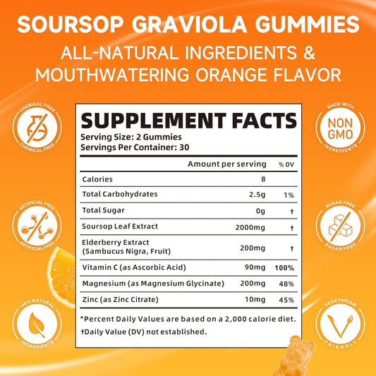 Immune-Boosting Soursop Graviola Gummies with Elderberry - 2000mg Soursop & 200mg Elderberry, Enhanced Vitamin C, Antioxidant-Rich, Gluten-Free & Vegan - 60 Gummies