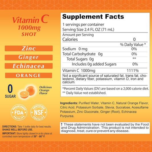 Immunity Boosting Vitamin C Shot with Zinc, Ginger, Echinacea - Cold Fighter - Orange Flavor - 1000MG - 20 Pack