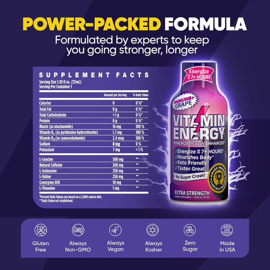 Immunity Formula Energy Drink Shots - Grape Flavor, Sugar & Carb-Free, Natural Nutrients for Energy & Immune Support, up to 7+ Hours, 1.93 fl oz, Pack of 12