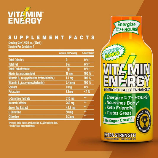 Immunity-Boosting Mango Energy Shots | Natural Nutrients for Energy & Immune Support | Sugar & Carb Free | 7+ Hours Energy | 1.93 fl oz - Pack of 12