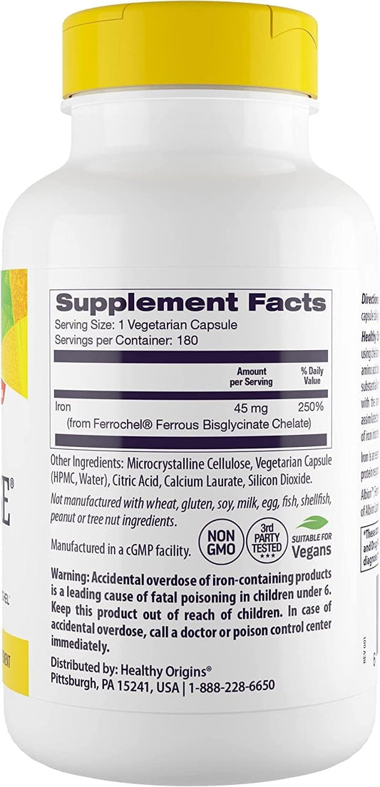 Iron Ease with Ferrochel 45mg - Gentle Iron Supplements for Men & Women - Vegan, Non-GMO, Gluten-Free - 180 Capsules