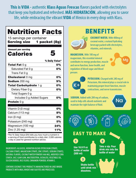 KLASS VIDA Horchata Electrolyte Agua Fresca Drink Mix Powder Packets - 15 Single Serve Sticks, Sugar-Free, Low Calorie