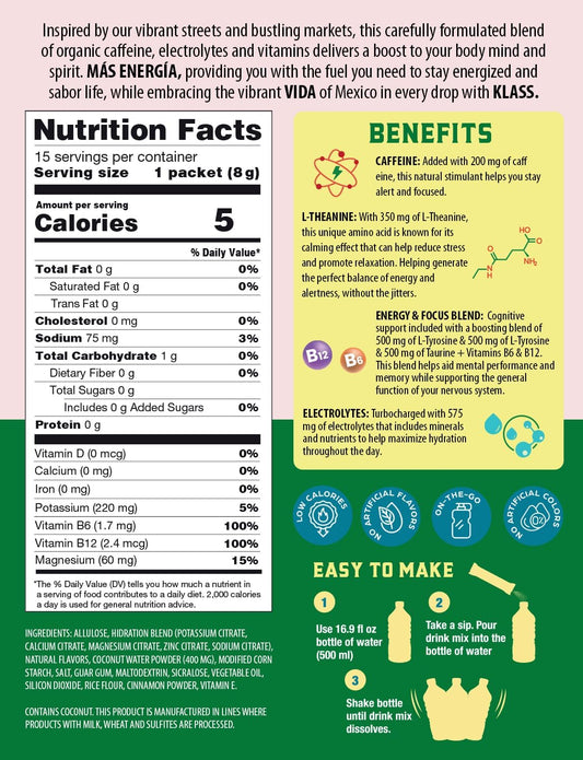 KLASS VIDA Sugar-Free Electrolyte Drink Mix, Horchata Flavor with Caffeine & Theanine, 15 Single Serve Packets - Hydration and Energy Boost, Low Calorie