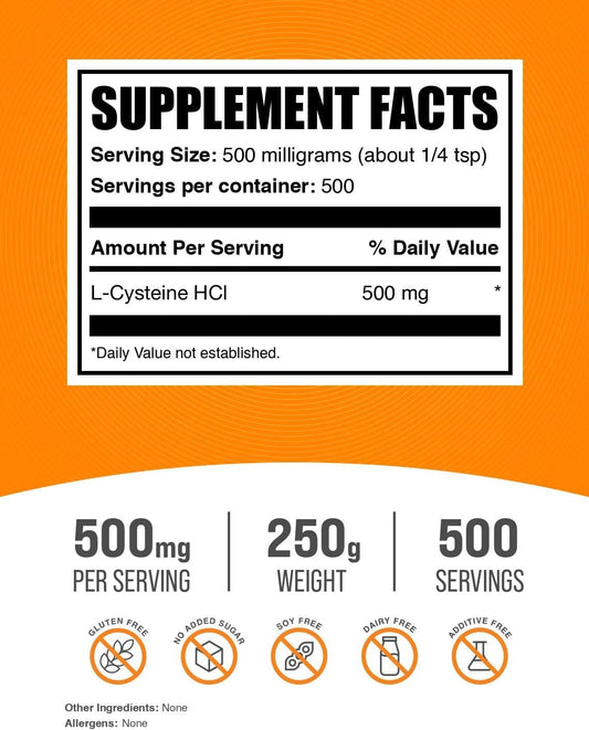 L-Cysteine HCl Powder 500mg - Amino Acid Supplement, Gluten-Free, 250g (8.8 oz) - BulkSupplements