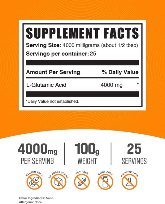 L-Glutamic Acid Powder - Amino Acid Supplement for Gut Health - 4000mg per Serving - Gluten Free - 100g (3.5 oz) - Pack of 1