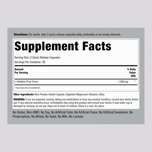 L-Histidine 1000mg Capsules - Free Form Supplement, Non-GMO & Gluten Free - 60 Count