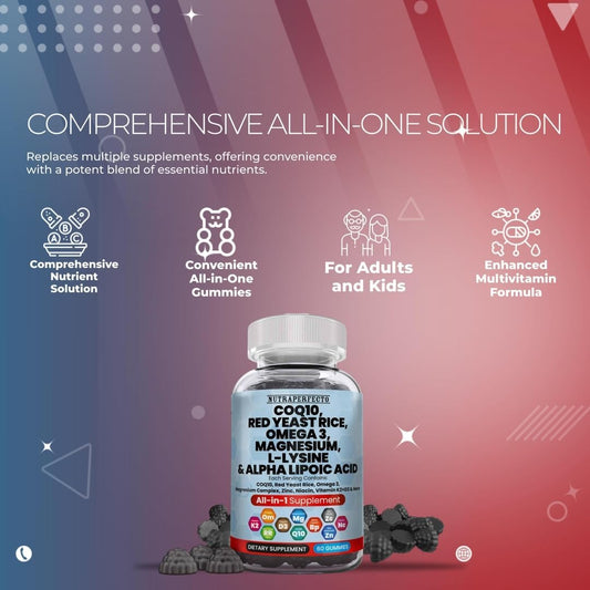 L-Lysine Coq10 Alpha Lipoic Acid Gummies with Red Yeast Rice and Magnesium - Amino Acid Supplements for Adults and Kids - Contains Omega 3 Niacin Zinc Vitamin K2 D3 B3 - 60 Gummy Bears for Women and Men