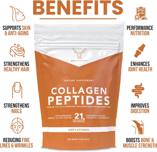 Large 22oz OX Collagen Peptides Powder, Hydrolyzed for Healthy Skin Hair Nail Joints - Grass Fed, Pasture Raised, Non-GMO, Gluten Free, 3P Tested - Unflavored - Certified cGMP