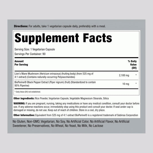 Lions Mane Mushroom Capsules 2100mg - 90 Count, Fruiting Body Extract with Black Pepper for Enhanced Absorption - Vegetarian & Non-GMO