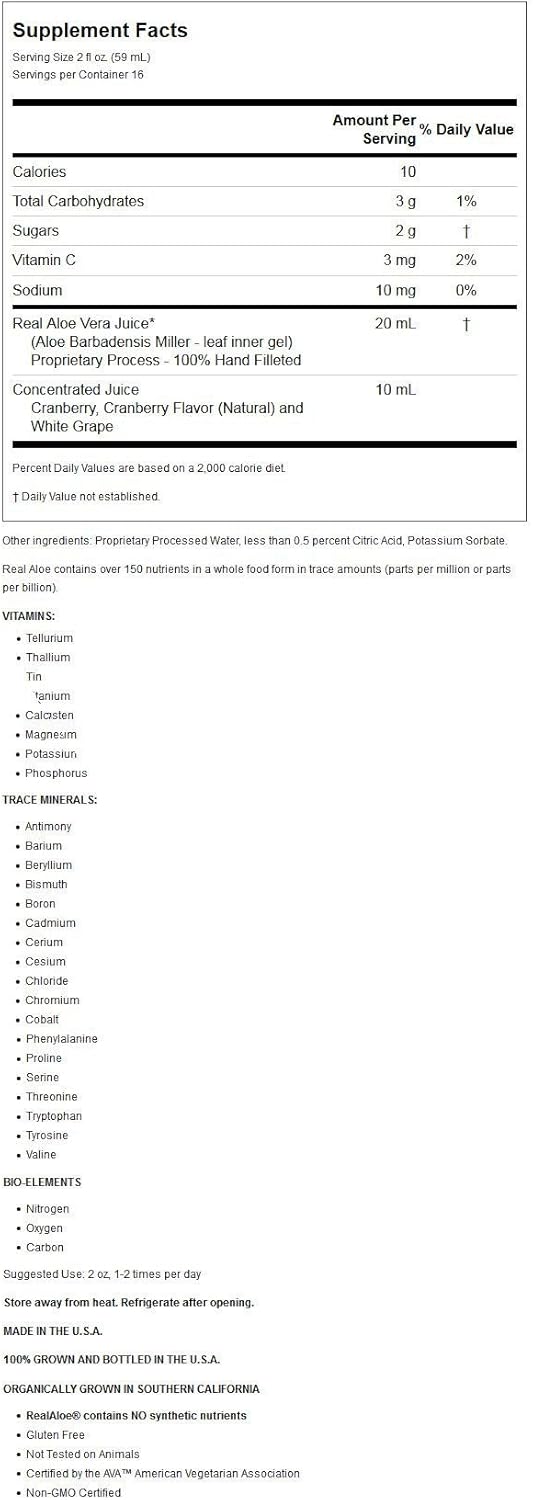 32 floz Real Aloe Organic CranAloe Juice with Aloe Vera and Cranberry Supplement - California Grown Since 1972Vendor:Real AloeRegular price $105.17 AUDRegular priceUnit price / per-