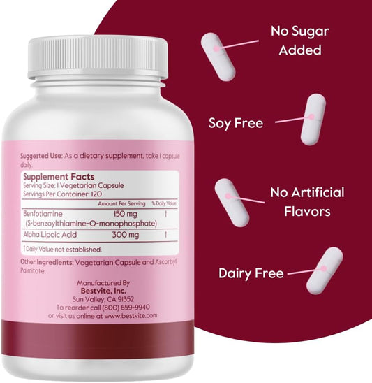 Benfotiamine 150mg and Alpha Lipoic Acid 300mg Capsules - Vegan, Gluten-Free, Non-GMO - 120 Vegetarian Capsules - No StearatesVendor:BESTVITERegular price $129.57 AUDRegular priceUnit price / per-