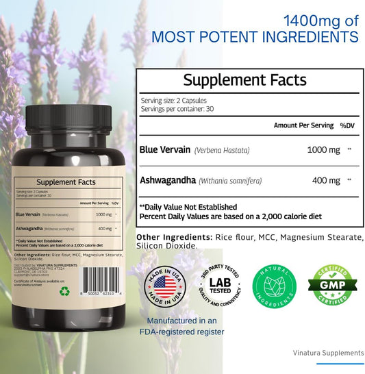 Blue Vervain and Ashwagandha Blend Capsules - 1400mg per serving, Brain Health and Stress Relief Support, 60 CountVendor:VINATURARegular price $131.79 AUDRegular priceUnit price / per-