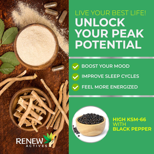 Focus & Mood Support: Renew Actives Ashwagandha KSM 66 Supplement with Black Pepper - Energy Boost & Sleep Aid - 120 Capsules