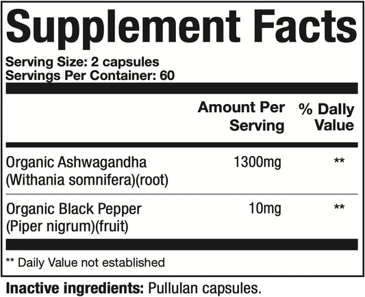 Organic Ashwagandha Root 1300mg with Black Pepper - Stress & Mood Support Supplement (120 Capsules)