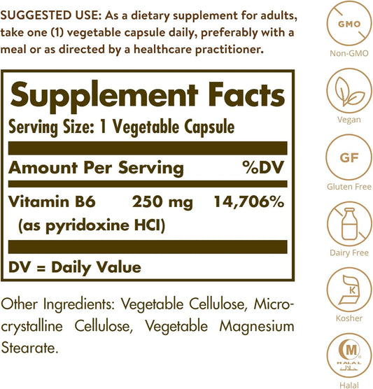 Solgar Vitamin B6 Capsules - 250 mg, 100 Count - Energy Metabolism & Heart Health Support - Non-GMO, Vegan, Gluten-FreeVendor:SOLGARRegular price $91.61 AUDRegular priceUnit price / per-