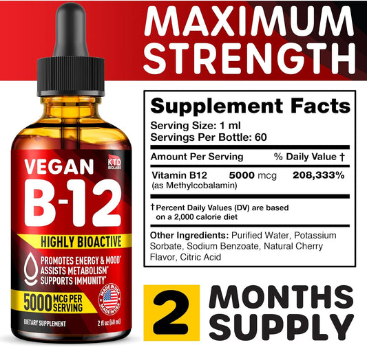 Pack of 2 Vegan B12 Sublingual Drops for Energy, Mood & Memory - 5000 mcg Methylcobalamin - Made in USA - Highly Bioavailable - 2 fl. oz.