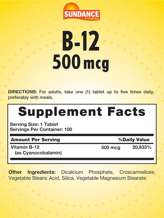 Sundance Vitamin B-12 500mcg: 90 Vegetarian Tablets, Non-GMO & Gluten Free Formula, Essential SupplementVendor:SundanceRegular price $88.22 AUDRegular priceUnit price / per-