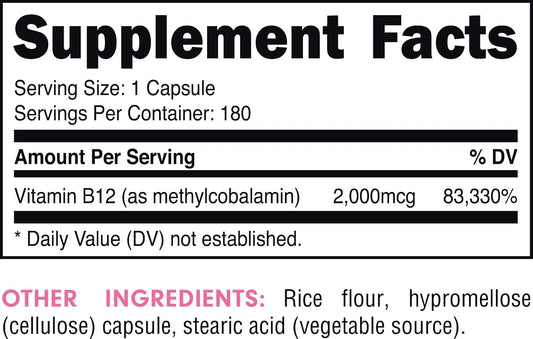 Vitamin B12 2000mcg Methylcobalamin Capsules - 180 Servings, Essentials Supplement