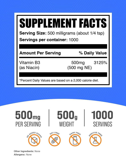 Niacin Powder - Vitamin B3 Supplement 500mg - Niacin Flush with Flushing - Gluten Free - 500g (1.1 lbs) Pack of 1Vendor:BulkSupplementsRegular price $129.51 AUDRegular priceUnit price / per-