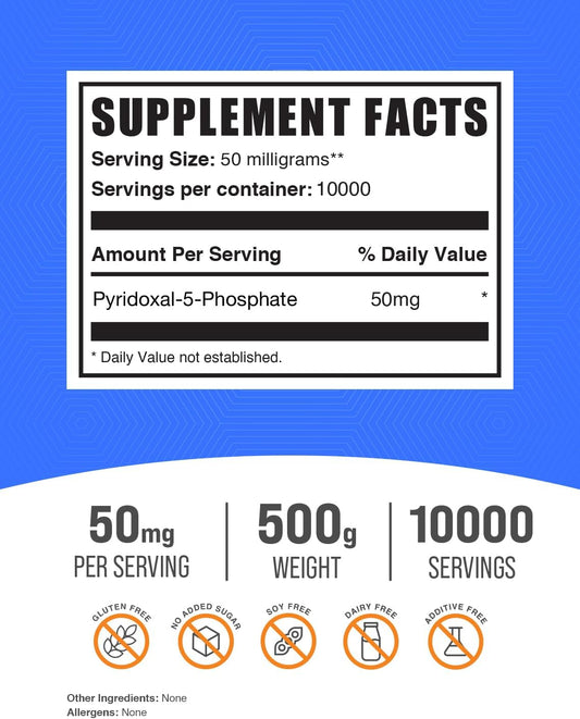 Pyridoxal 5 Phosphate Powder - P-5-P Vitamin B6 Supplement, 50mg per Serving, Gluten Free, 500g (1.1 lbs)Vendor:BulkSupplementsRegular price $334.30 AUDRegular priceUnit price / per-