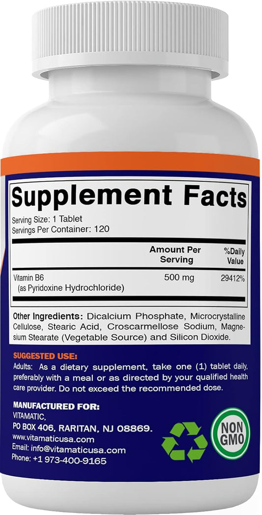 Vitamatic Vitamin B6 500mg - 120 Vegetarian Tablets for Energy, Metabolism, and Immune HealthVendor:VitamaticRegular price $107.34 AUDRegular priceUnit price / per