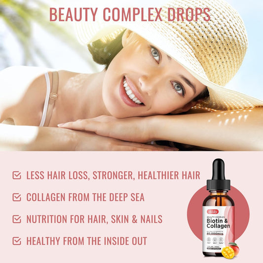 Liquid Collagen & Biotin Hair Growth Supplements - 10000mcg Biotin, 20000mcg Collagen Peptides - Hair Vitamins for Women & Men - Skin, Nail Strengthener - Made in USA - 2 floz