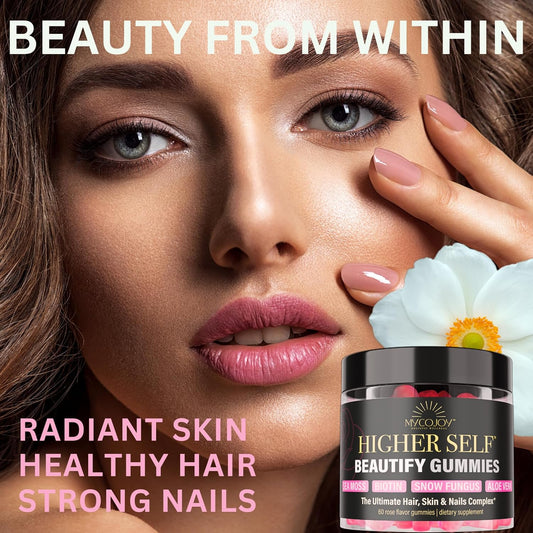 MYCOJOY Higher SELF™ Beautify Gummies with Sea Moss, Biotin, Snow Fungus, Aloe Vera for Hair, Skin, Nails - 60 Vegan Rose Flavor Gummies