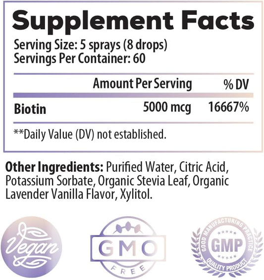 Organic Lavender Vanilla Biotin Liquid Spray - 5000mcg Hair Growth Vitamin for Thickness and Volume - Skin & Nail Health - Keto & Vegan - Ideal Infusion B-Bomb
