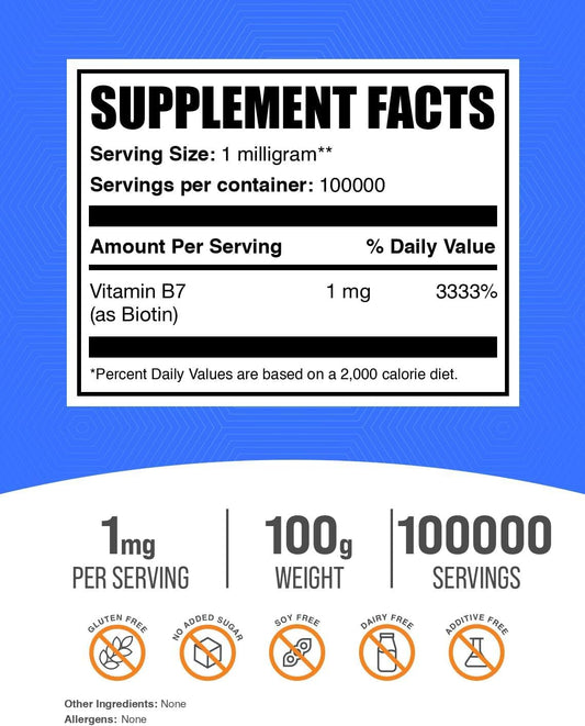 BulkSupplements.com Biotin Powder - Pure Vitamin B7 Supplement for Hair, Skin & Nails - Gluten Free, 1mg per Serving, 100g (3.5 oz)Vendor:BulkSupplementsRegular price $157.63 AUDRegular priceUnit price / per-