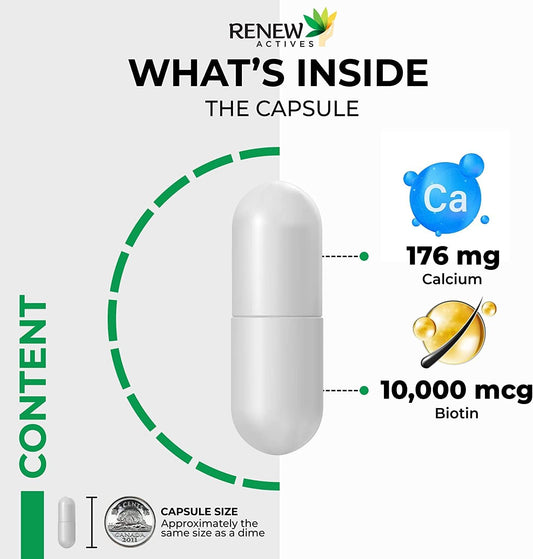 Renew Actives Biotin & Calcium 10000mcg Capsules for Hair, Nail, Skin - Supports Bone, Teeth Health - Prevents Deficiency, Boosts Wellness - 120ct