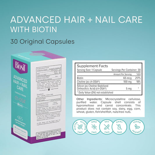 30 Capsules of Biosil Advanced Hair and Nail Care with ch-OSA and Biotin for Hair and Nail Growth, Strength, and Thickness - 15-Day Supply
