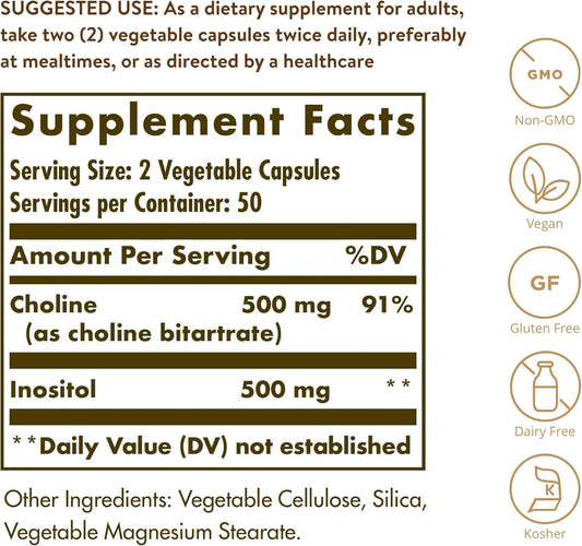 Solgar Choline Inositol 500mg Capsules - 100 Veg Caps, Pack of 2 - Non-GMO, Vegan, Kosher, Gluten Free, Dairy Free - 100 Servings