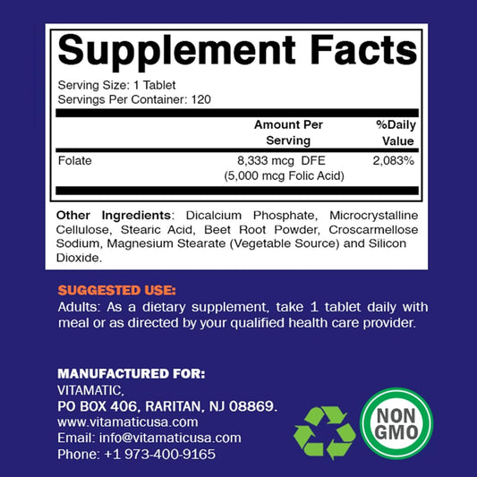 High Potency Folic Acid (Vitamin B9) Supplement | 5000 Mcg per Serving | 120 Tablets | Non-GMO | Gluten-Free | USA-Made